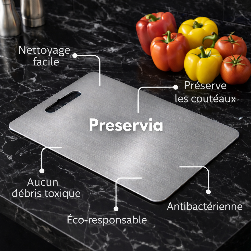 La planche à découper PRESERVIA en titane incarne l’excellence absolue : une surface ultra-hygiénique, indestructible et sans micro-plastiques, pensée pour ceux qui refusent le compromis entre santé, performance et élégance.