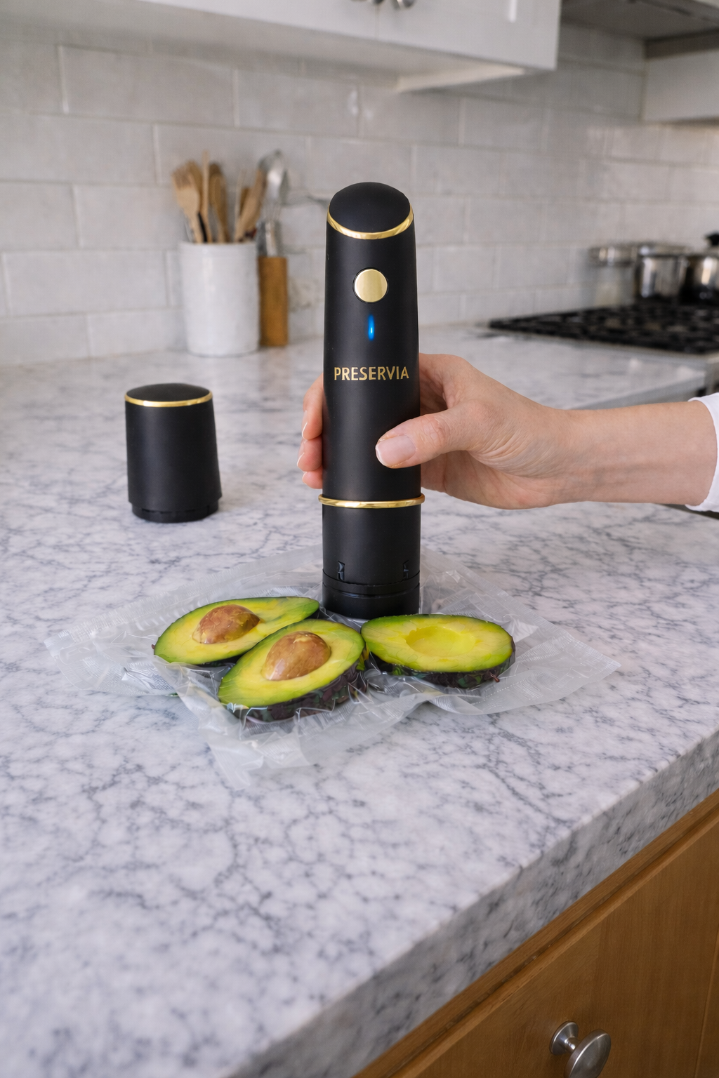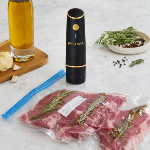 PRESERVIA™ est l’appareil de mise sous vide compact et puissant qui prolonge la fraîcheur de vos aliments en quelques secondes.
